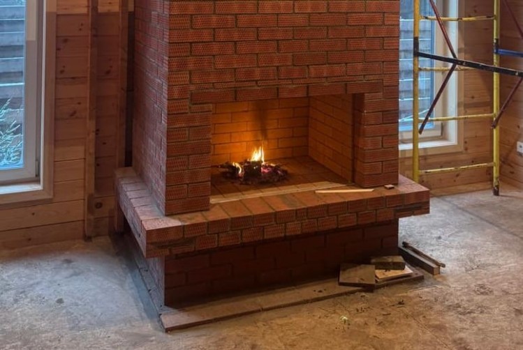 В коттеджном поселке «Лаки Парк» выполнили полный цикл устройства кирпичного камина в деревянном доме: независимое основание, экран с вентзазором, шамотная топка, корректные узлы проходов и проверенный дымоход.