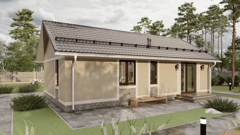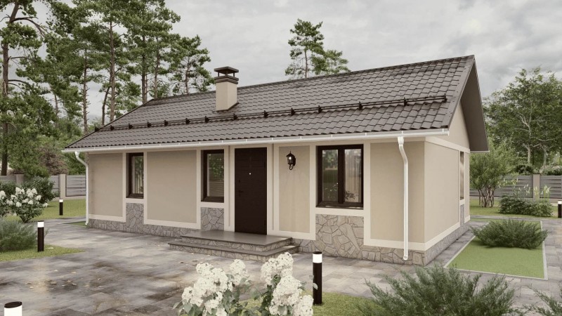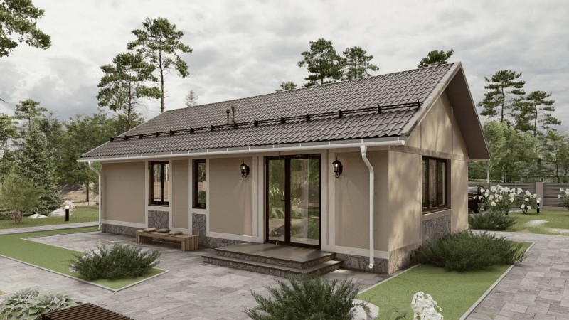 Данный проект отличается рациональным использованием площади. Все помещения изолированы и имеют четкое функциональное назначение. Наличие двух спален делает дом универсальным для семьи с одним ребенком, пары или тех, кому нужна гостевая комната. Большой плюс — отдельная кладовая и объединенная кухня-гостиная, что соответствует трендам современного комфортного жилья.