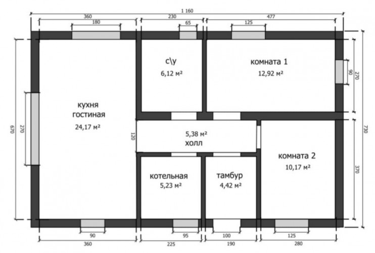 Данный проект представляет собой современный дом с эффективной и продуманной планировкой. Ключевая особенность — объединенное пространство кухни-гостиной, которое является центром жилья, и две изолированные спальни.