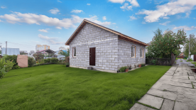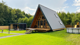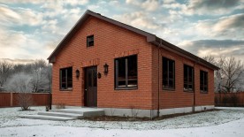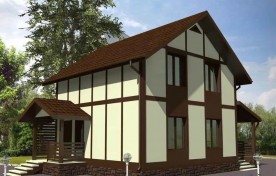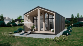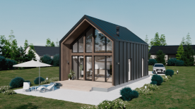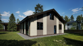 Дом для семьи из трех человек с просторной открытой террасой (22,7 м2). На входе в здание предусмотрен небольшой тамбур, где удобно хранить верхнюю одежду и уличную обувь.
