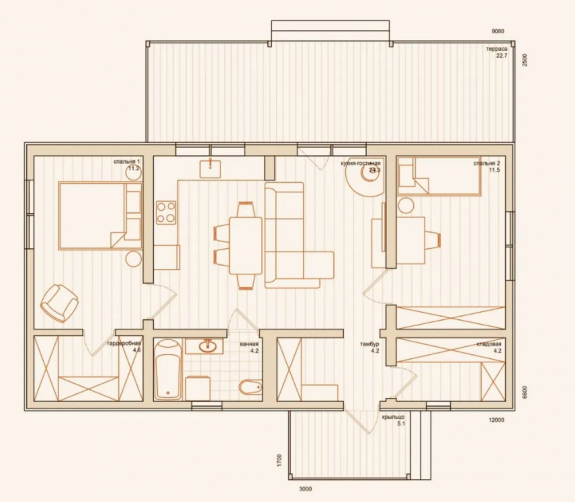 Модульный дом для круглогодичного проживания 3-4 человек. В проекте предусмотрены помещения для хранения одежды (гардеробная) и необходимого садового инвентаря (кладовая). Размер жилой площади – 47 м2.