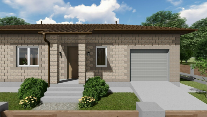 Проект предполагает в томе - тамбур 4 м2; холл 12,88 м2; кухня-гостиная 27,21 м2; три жилые комнаты 11,17 - 11,68 - 11,66 м2; санузел совмещен с ванной комнатой 5,38 м2 (при желании разделяется); кладовая - 4 м2; гараж - 25,34 м2 и котельная 7,08 м2