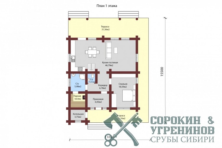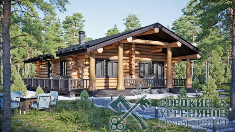 Проект одноэтажного дома-бани из бревна диаметром 300мм, размер бани 11,8х15,5м. Объем бревна в срубе 155м3, общая площадь сруба 192м2 включая террасы. Парная, душевая, санузел, гостиная с кухней, котельная, прихожая, спальная комната, и еще есть антресоль или палати можно так сказать. Большая терраса по кругу под одно крышей, сруб при этом выглядит приземистый типа шале.